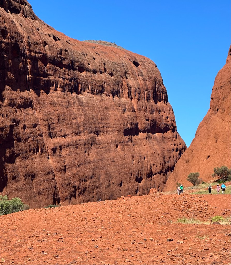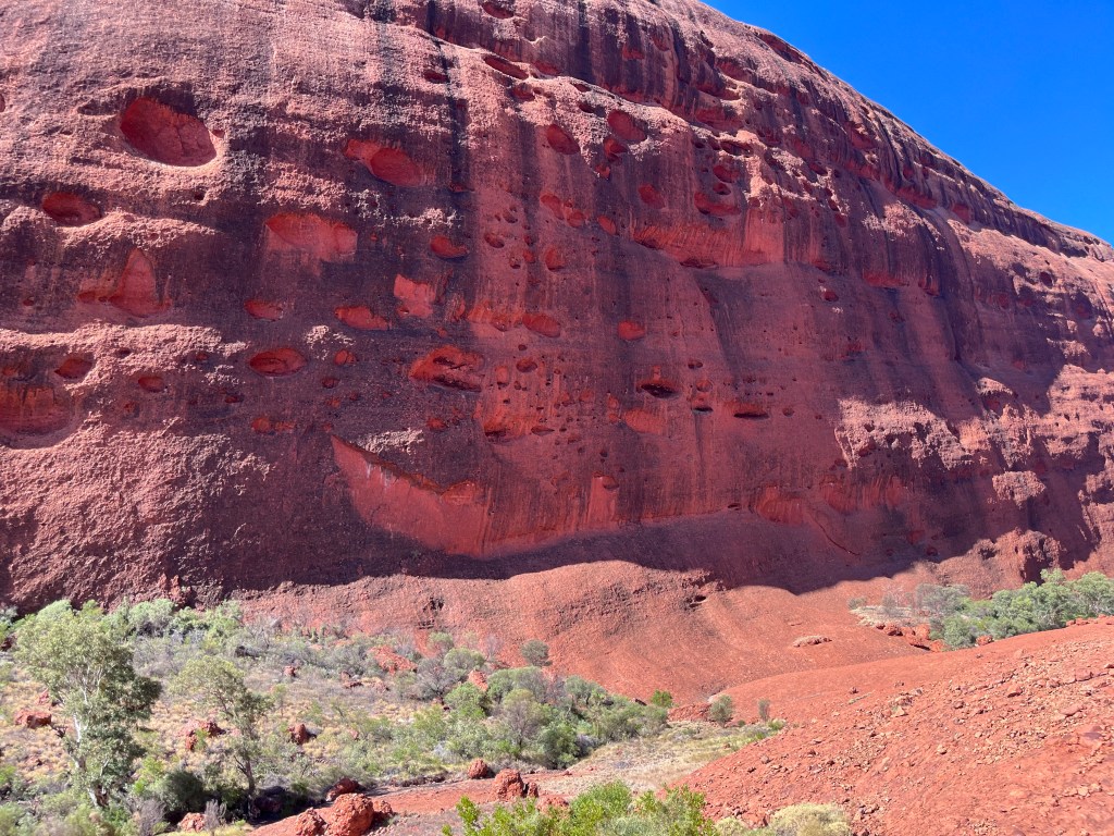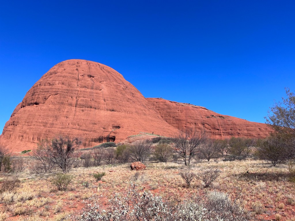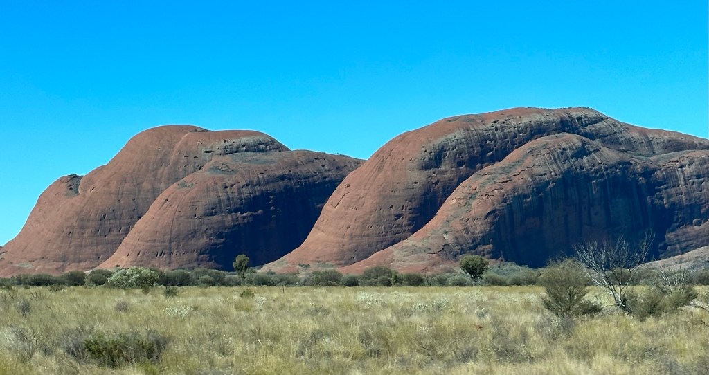 Kata Tjuṯa is massive. Like Uluru it is the product of seismic tectonic shifts as the continents shifted and moved over hundreds of millions of years. The conglomerate rock that makes up the domes is of harder stuff than the sandstone at Uluru. In terms of scale, Kata Tjuṯa has a circumference of 44km, over four times that of Uluru, and it’s highest point is 550 meters, significantly higher than Uluru. The two landmarks are separated by 75km, a distance that appears much shorter in the flat semi arid desert that is the Outback.