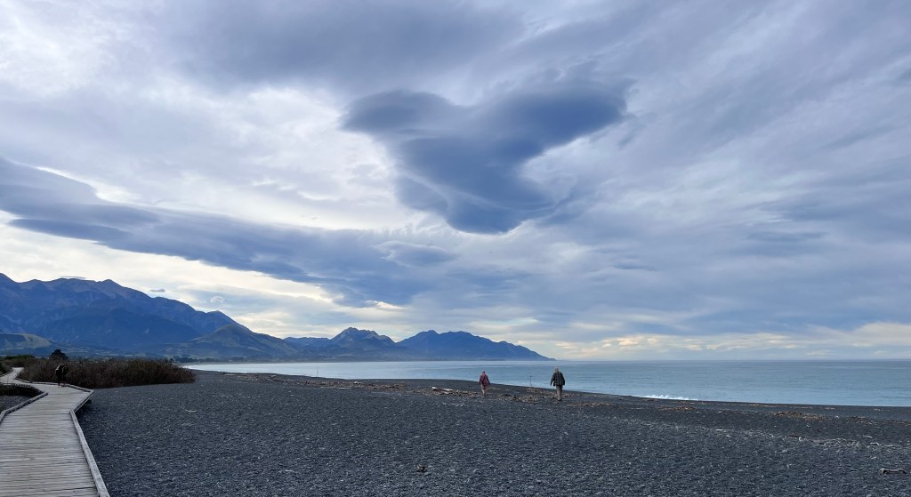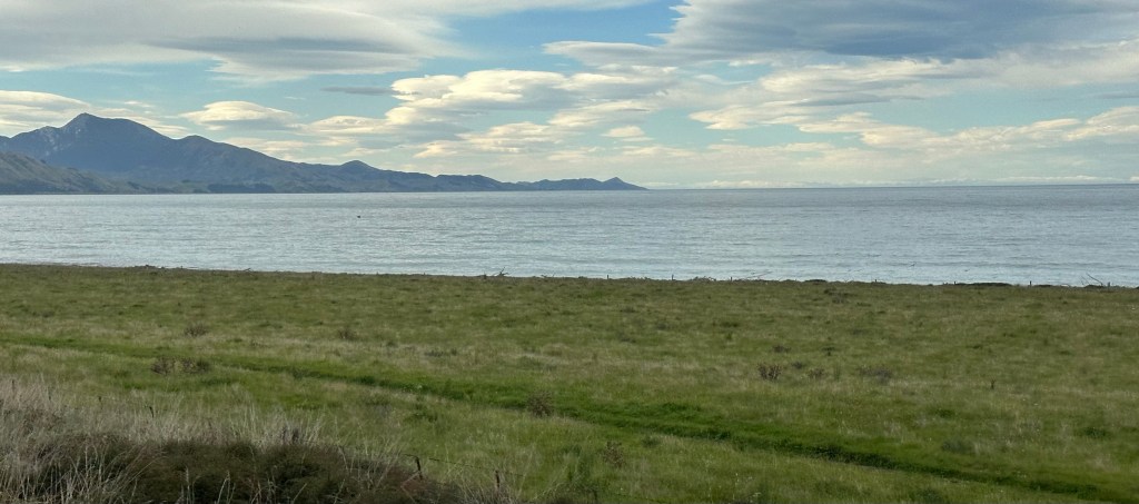 We decided on the option of taking the Coastal Pacific train, one of New Zealand Rail’s “Great Journeys”. Not having a car meant giving up on a planned whale watching trip in Kaikoura, but the train went along the coastline through that area. Maybe, we told each other, we’d get lucky and see something worthwhile.