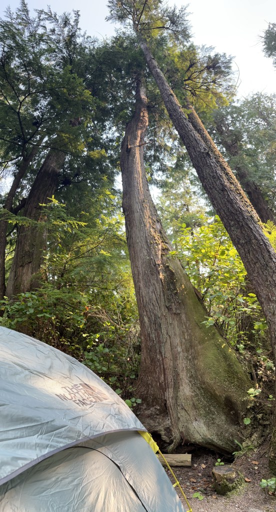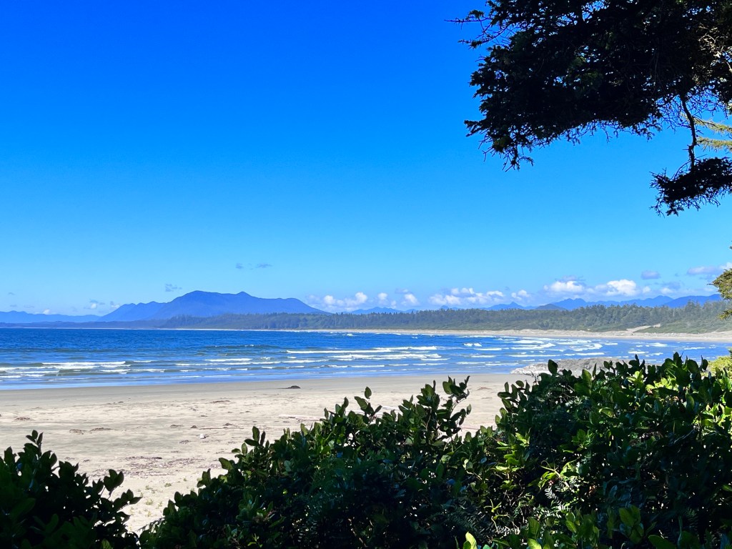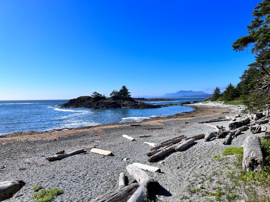 We had booked campsites at Bella Pacifica on Mackenzie Beach. All of the public campsites in Pacific Rim National Park had disappeared within seconds of becoming available in the early spring, so this private campground was our alternative. Our sites were located in the woods amidst the cedars, but although we lacked an ocean view the sound and smell of the surf was omnipresent. The path to the beach was a three minute walk.