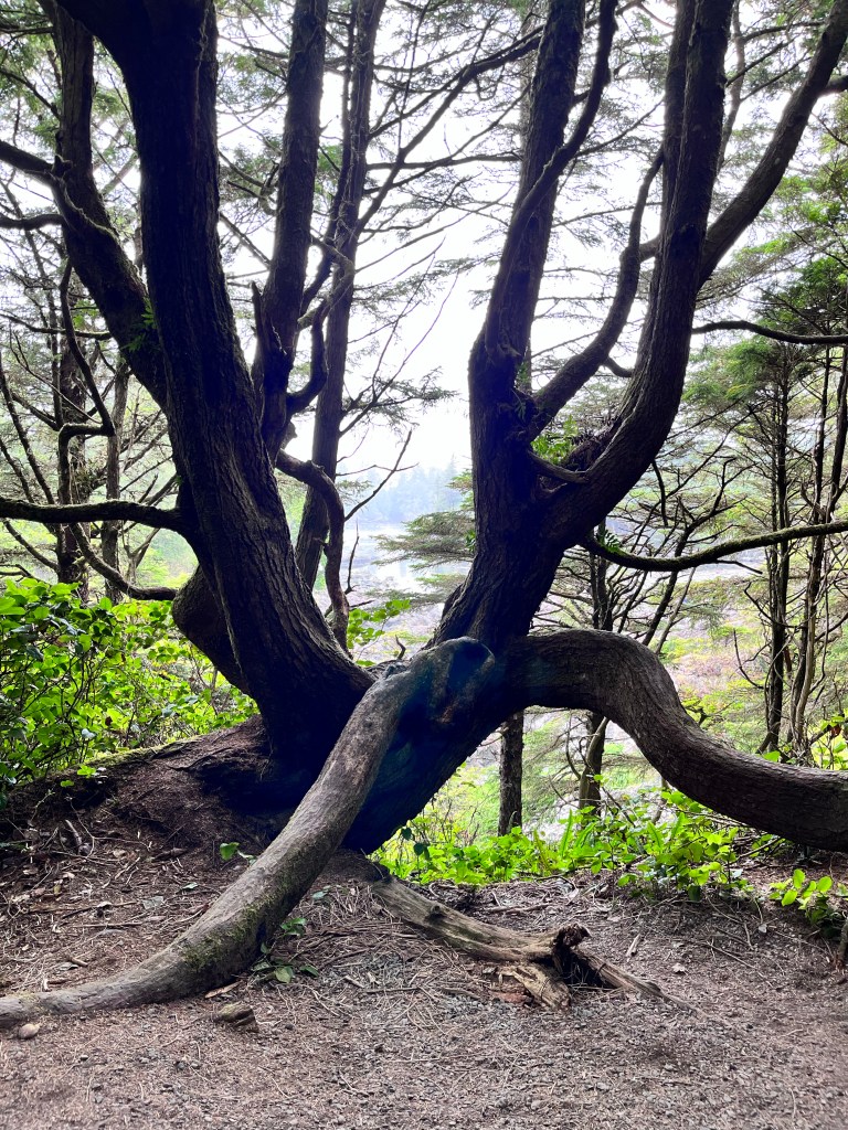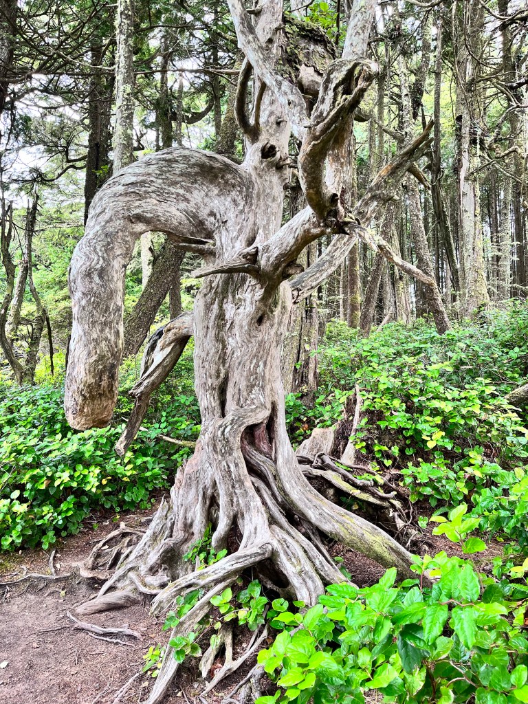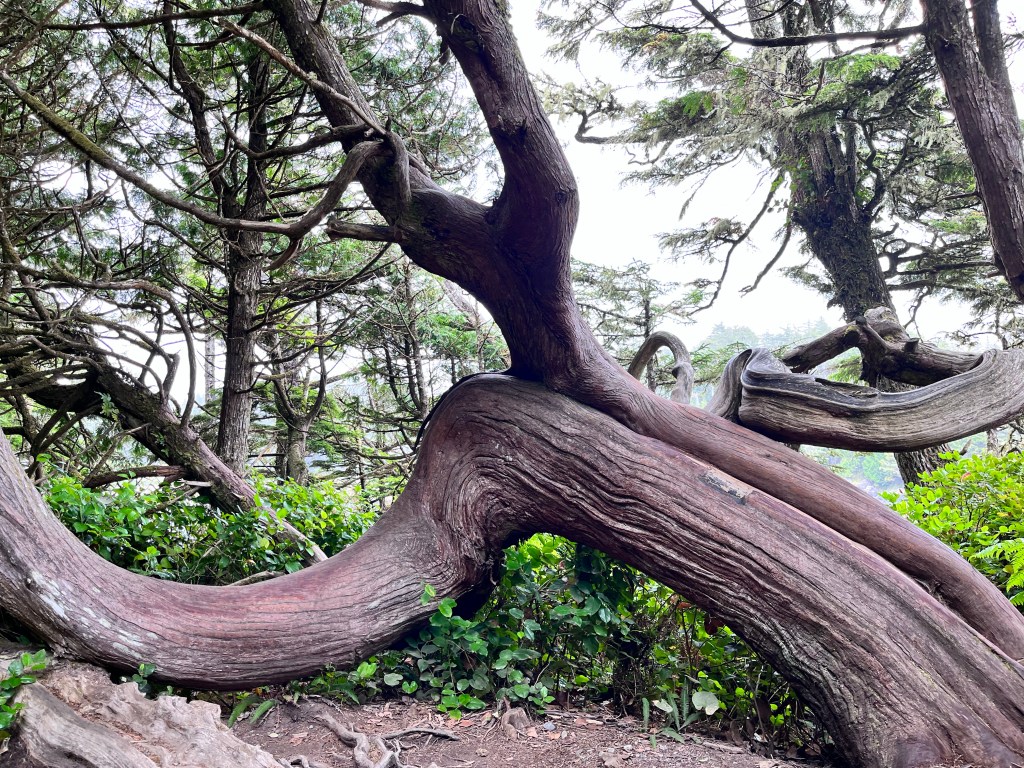 Ironically, we explored the Lighthouse Loop, a coastline popular with storm chasers and one that featured a lighthouse, whistle buoys and foghorns, and a number of historic shipwrecks. The trail was fantastic: spooky sea sounds (thanks to the whistle buoys and crashing surf) and the gnarled, arthritic limbs of the coastal cedars which evoked a Grimms Brother’s woodland.