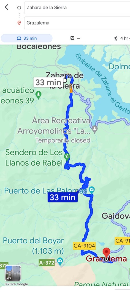 On the road that connects Zahara and Grazalema you follow a series of winding roads switchbacking and hairpining back and forth, up, across and down the mountains. The Google map looks a bit like a diagram of the lower intestine.