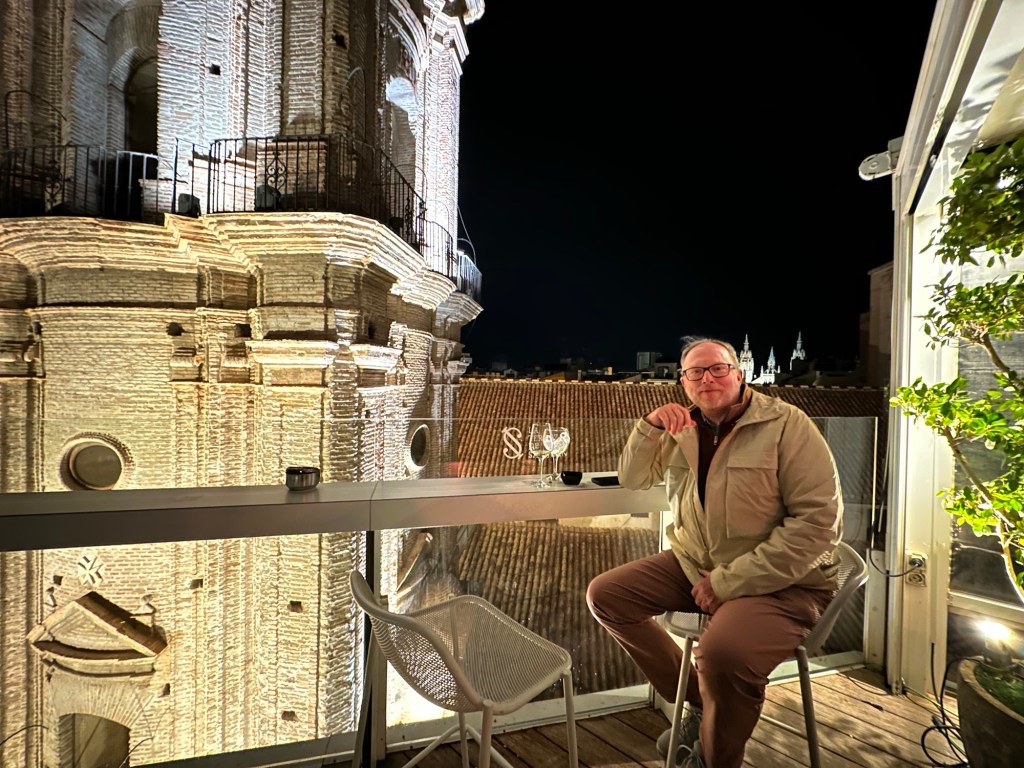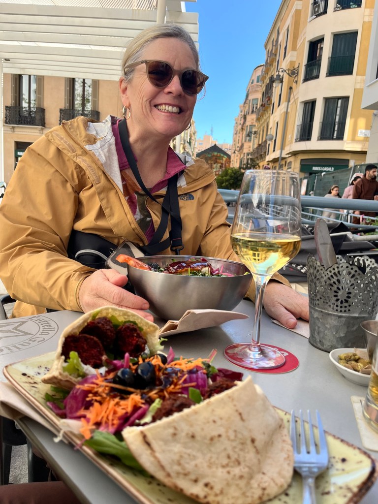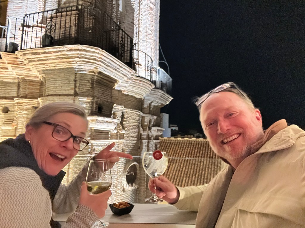 So we headed to La Terreza de San Juan, a rooftop patio with a fabulous view overlooking the gorgeous Church of Saint Juan and the historic centre of Malaga. I confidently ordered a vino blanco for Robin and a vino tinto for myself. Nodding in what appeared to be full comprehension the waiter left and returned with Robin’s white wine and… a gin and tonic for me. This, I thought, is an effort at restitution for the Cadiz gin and 7-Up disaster of last week.