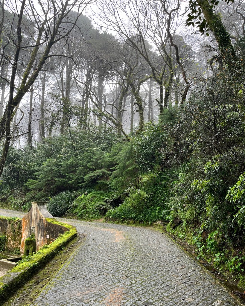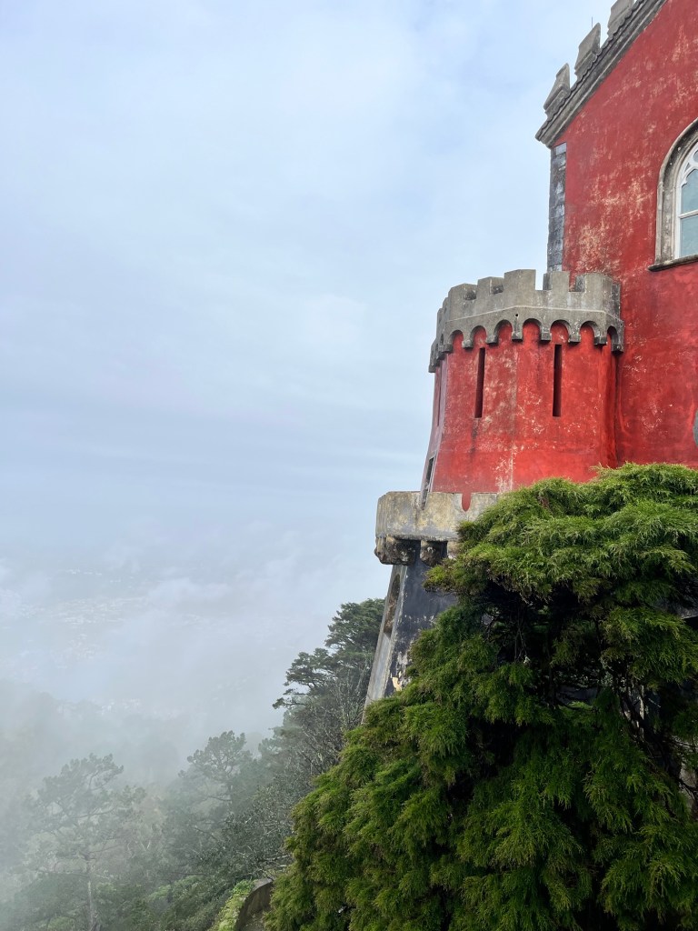It is set atop a lush hillside park filled with flowering plants and towering sequoias. On a less misty morning than when we visited you can see Lisbon and the ocean from the walk along the castle walls.