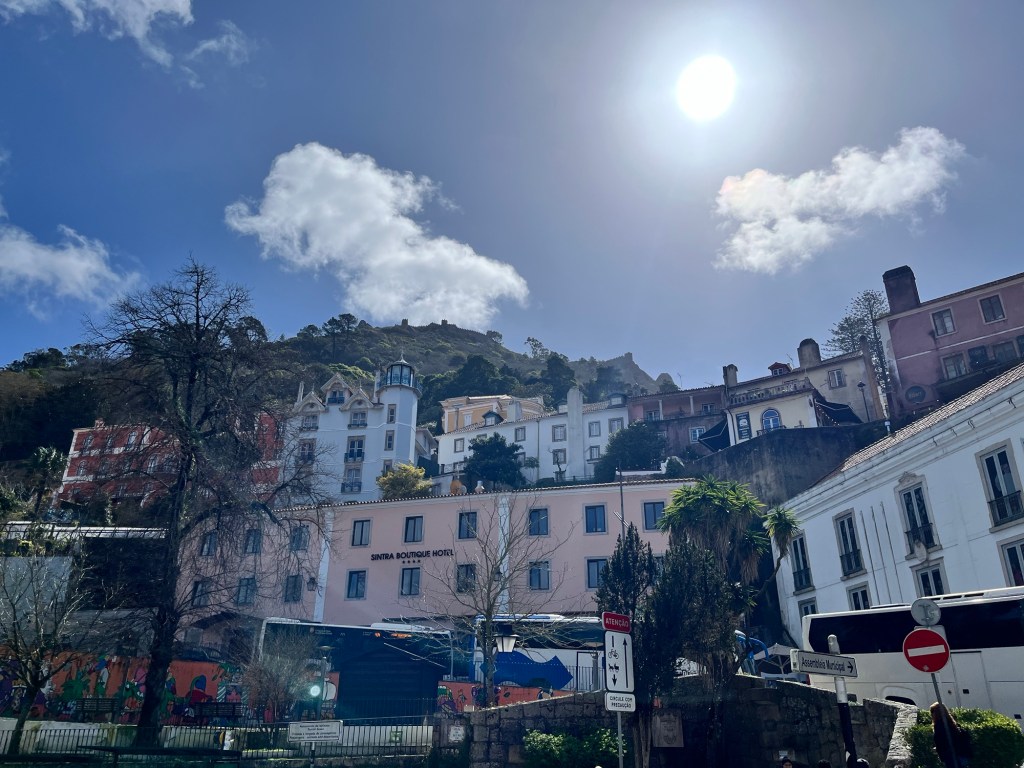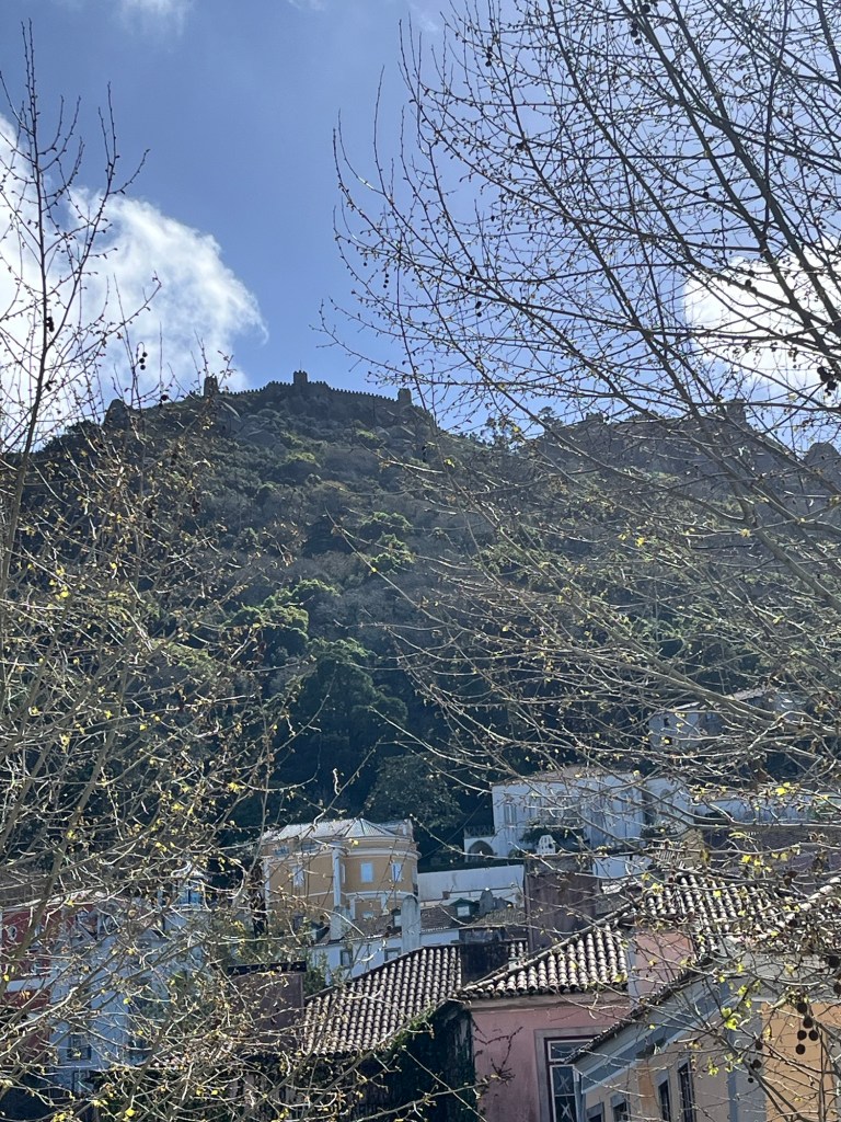 The town of Sintra sits below two impressive castles. One is the rebuilt ruin of the original Moorish garrison in this area. Its battlements and towers provide a solid and serious backdrop to the bright and tourist filled town.