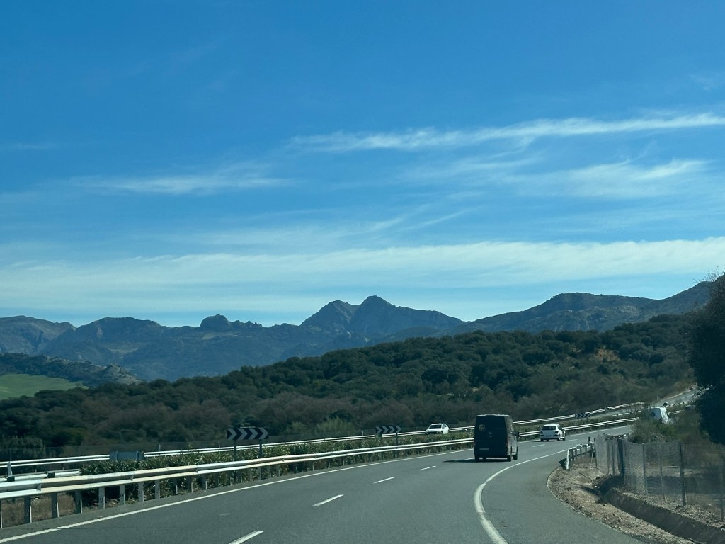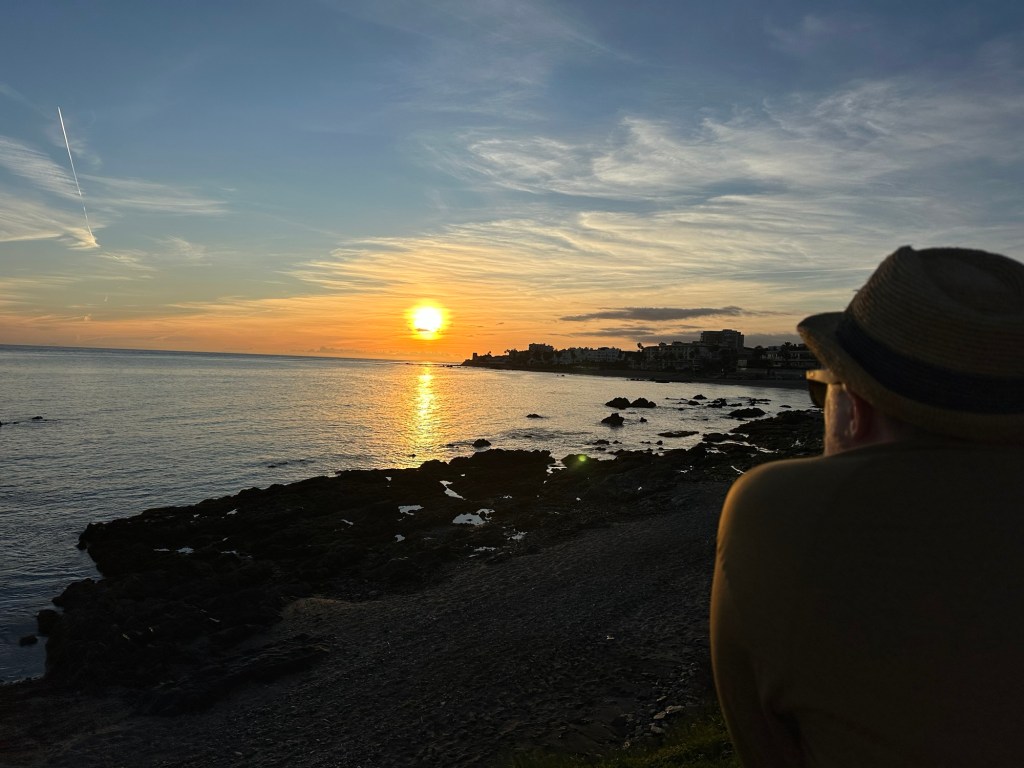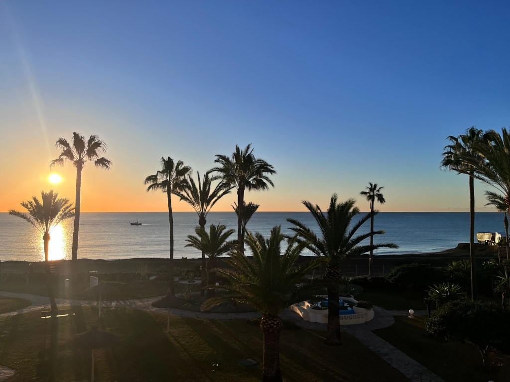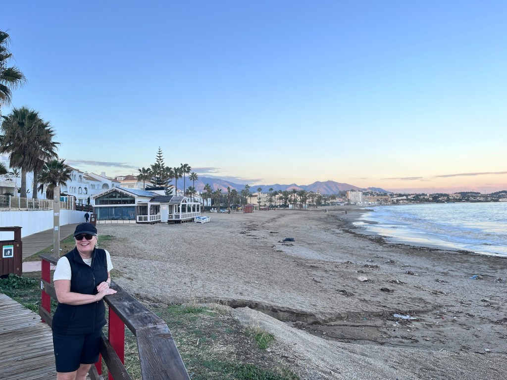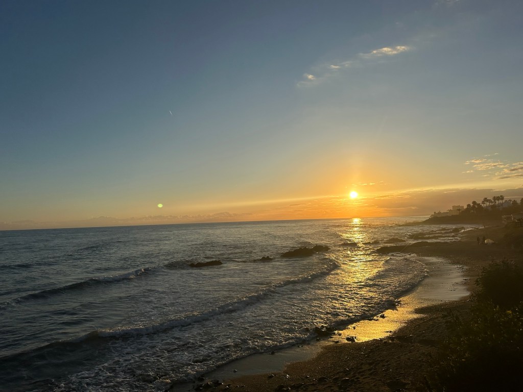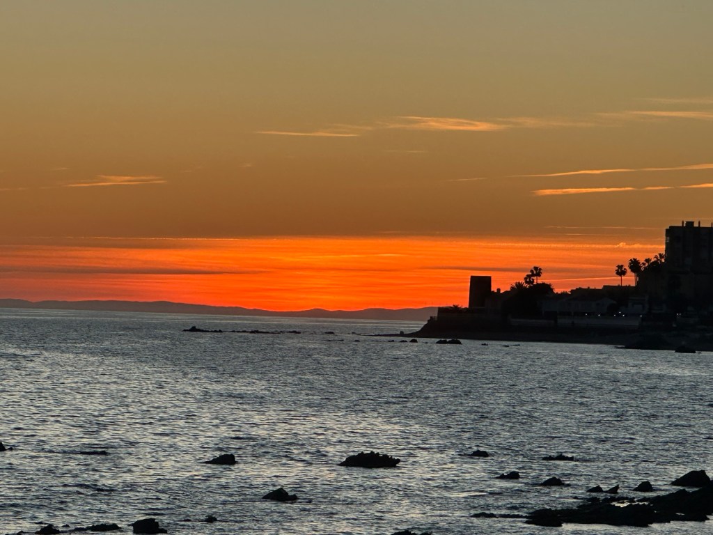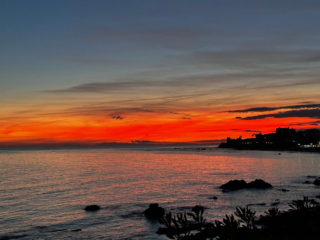 We typically went for two lengthy walks each day. As it is always an out and back, we would walk east to Mijas Cala if we had errands to do in the am, and west, towards Marbella and sunsets which backlight the Straight of Gibraltar. On clear days you can see the coast of Africa across the Mediterranean. The most spectacular view is westward at dusk towards the “Pillars of Hercules” defined by the Rock of Gibraltar and the mountain Jebel Moussa in Morocco.