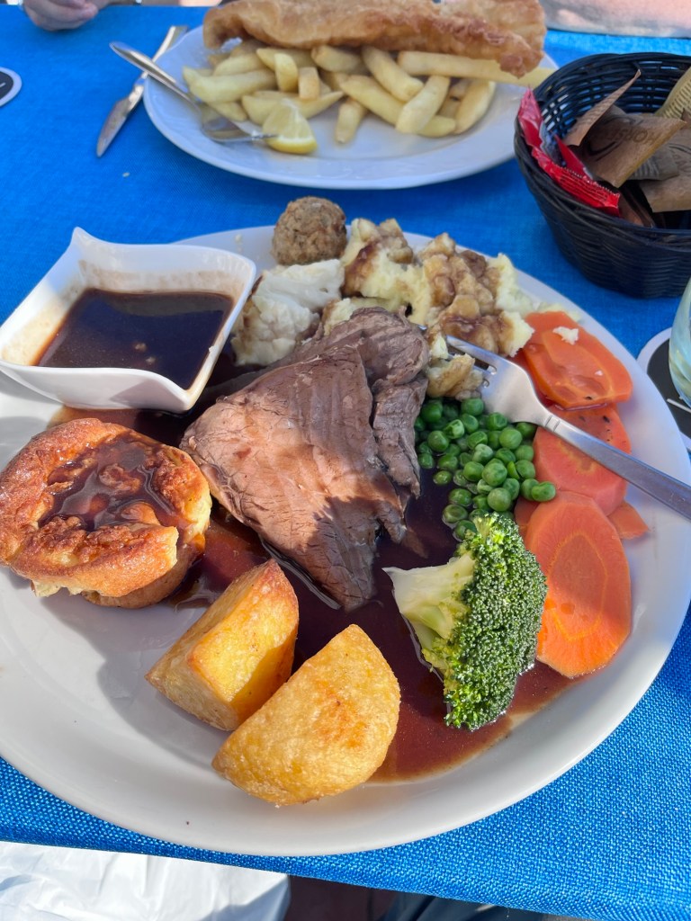 There is an embarrassment of options here in terms of eating and drinking. On the one end of the spectrum are the British themed restaurants and bars, complete with British food, drink and even British staff. The only one that we tried was called “The Garden” and we were drawn there by its spectacular location overlooking the coast. A self-described “beach bar”, it featured well priced food and drink, including Sunday specials of Roast Beef or Roast Chicken dinners complete with Yorkshire Pudding, covered in a thick coat of gravy, and including a backup “gravy boat” just in case your food isn’t sufficiently soggy. Of course we tried it! It was as expected. But the views!