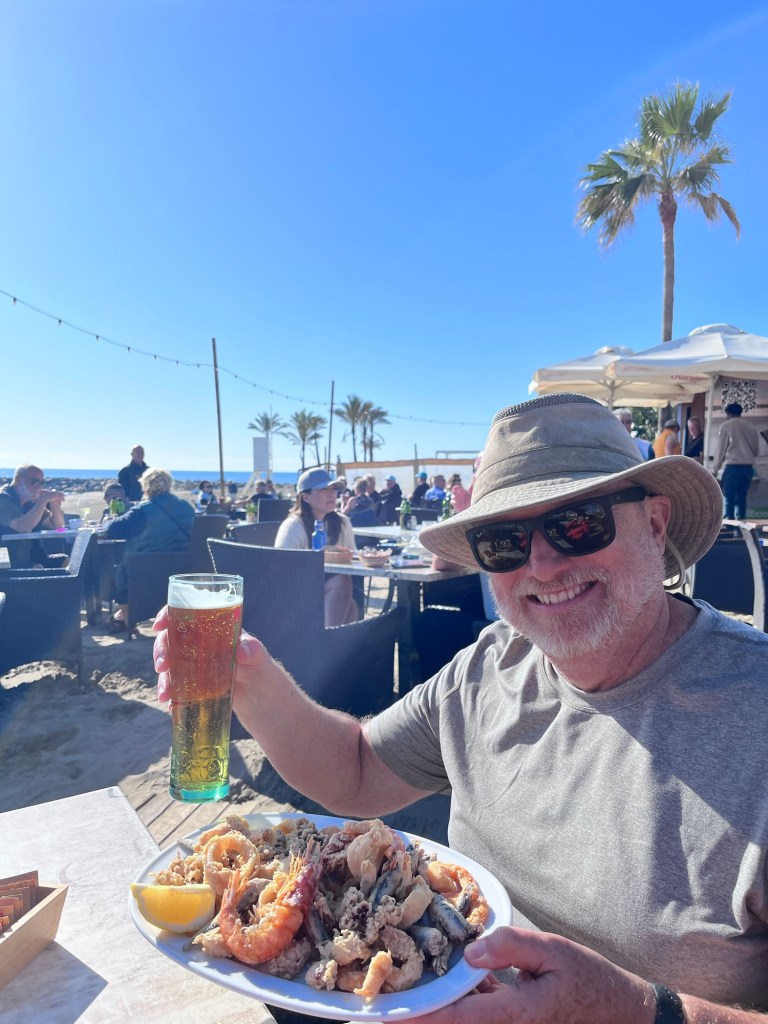Being on the beach, it was a great opportunity to eat a lot of sea food! We hit Andy’s Beach Bar in Cabopino, which featured an incredible view and a classic rock cover artist, an American dude of indeterminate age who said he moved to this part of Spain in 1982 amd never returned. He looked like he hadn’t slept since, but he could really play. Andy’s Beach Bar was a 14 km round trip down the beach and back, which certainly helped work off the giant plate of fried seafood.