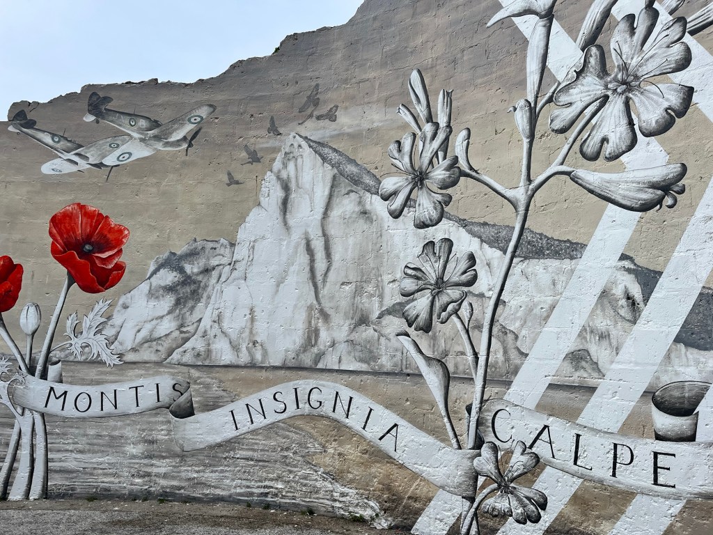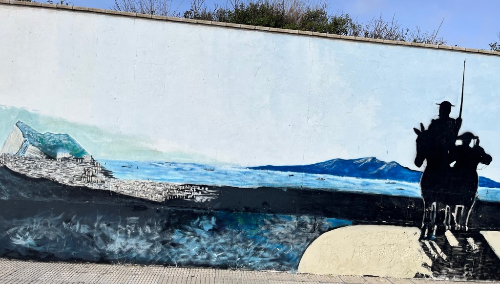 The best way to visit the territory is to park in La Linea near the border and walk across. Walking towards the border, we were greeted by this patriotic mural, featuring Picasso’s Don Quixote, a sketch of the Spanish literary hero and his sidekick, Sancho Panza, in this instance staring disapprovingly at the territory of Gibraltar.