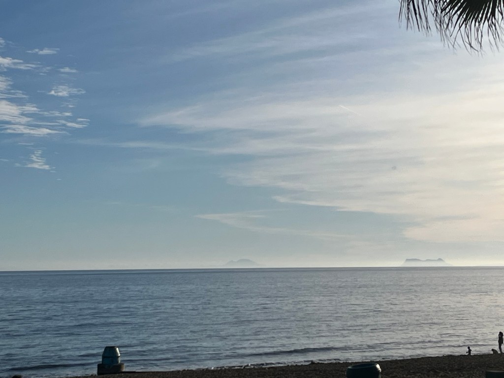 View of Gibraltar on the right and Jebel Muso in Morocco, on the left- the Pillars of Hercules (taken from the beach at Mary Lynn and Garth’s)