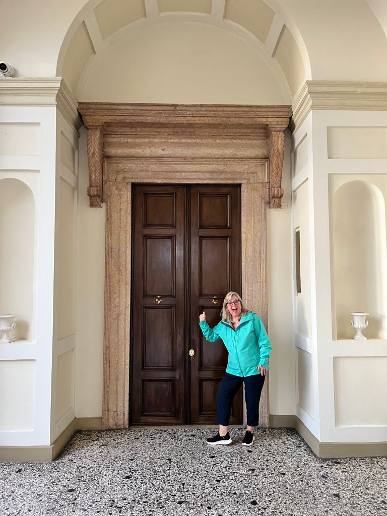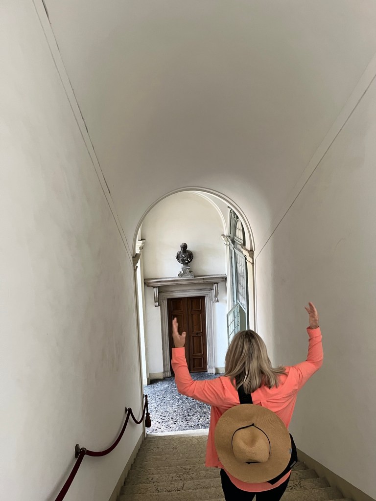 Sure enough, after a few more stops on the European Despots tour of Verona, Anna and I arrived at the top floor elevator stop to greet a sweating Robin as she emerged from the coffin (I mean elevator) intact.