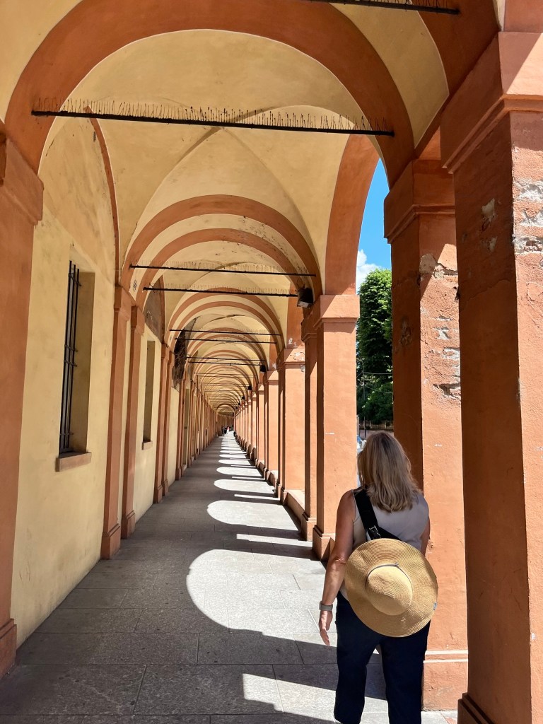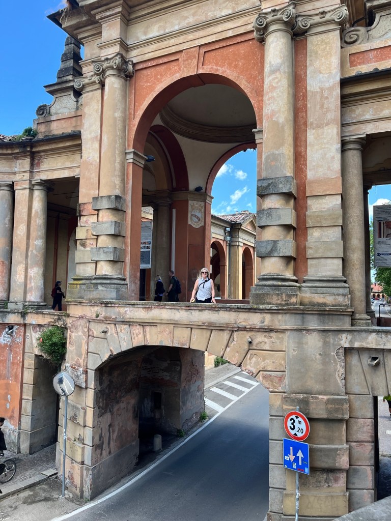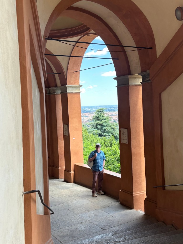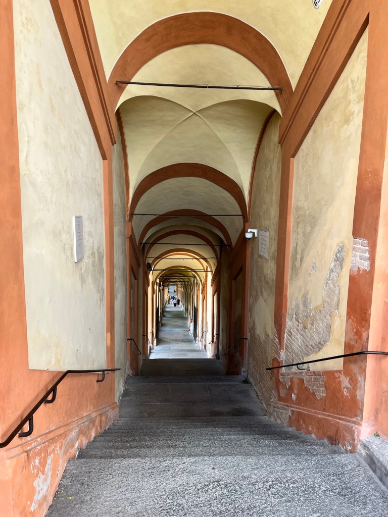 While the porticoes are omnipresent through the city, the most impressive ones are the 666 arches which run almost four kilometres from the city walls at Porta Saragozza to the Sanctuary of the Madonna Di San Luca. The final two kilometres of this mini pilgrimage are straight up a steep hill for over two kilometres. Given we only had two days in Bologna, Robin talked me into taking the tourist train from Piazza Maggiore in the centre of the old city to San Luca. Our compromise was that we would walk down.