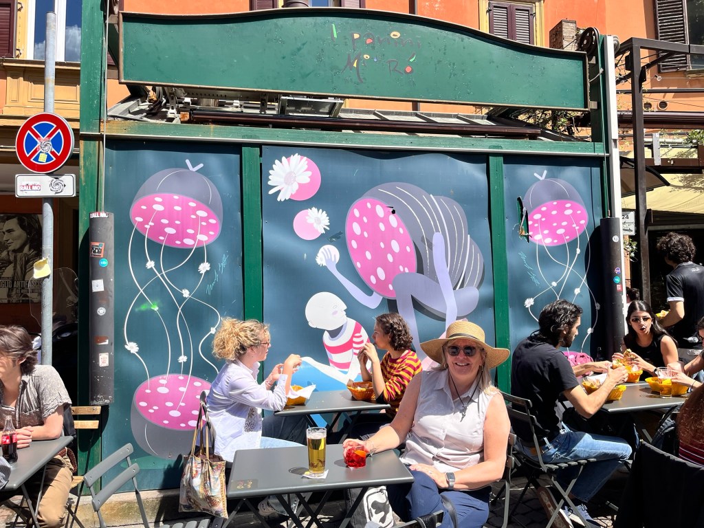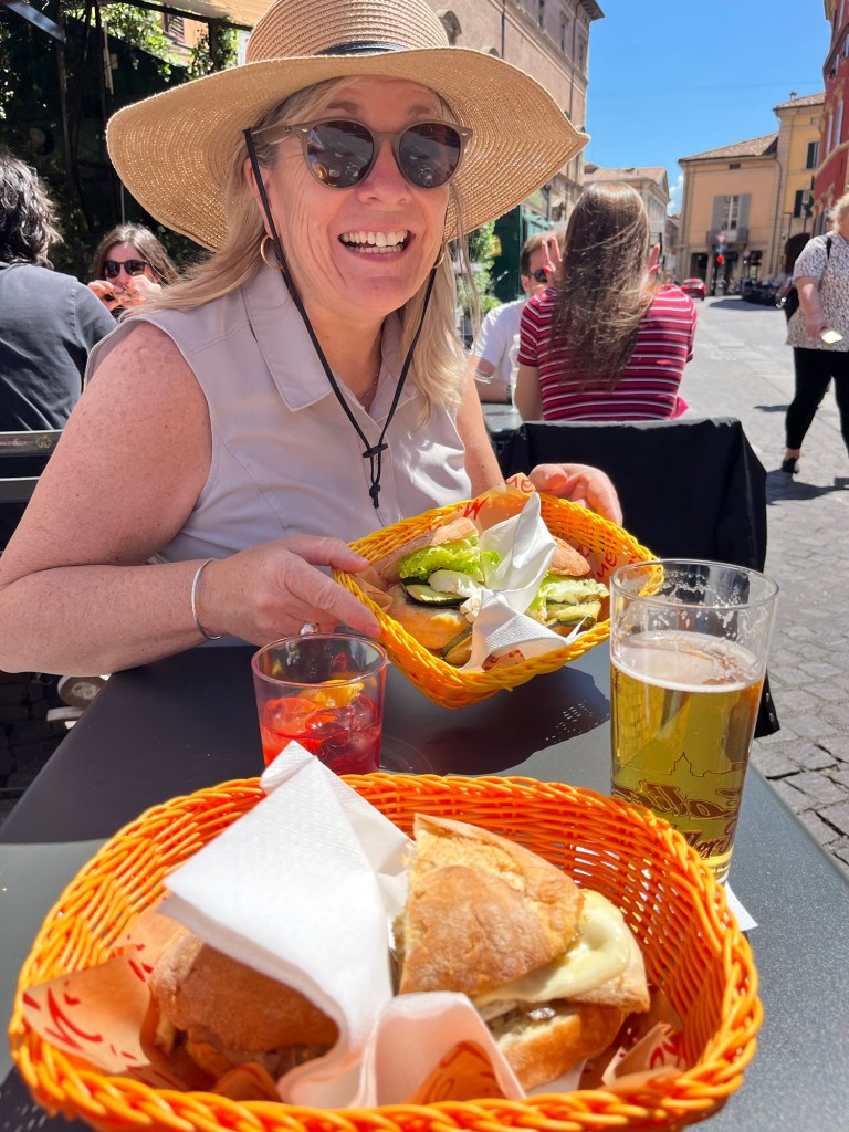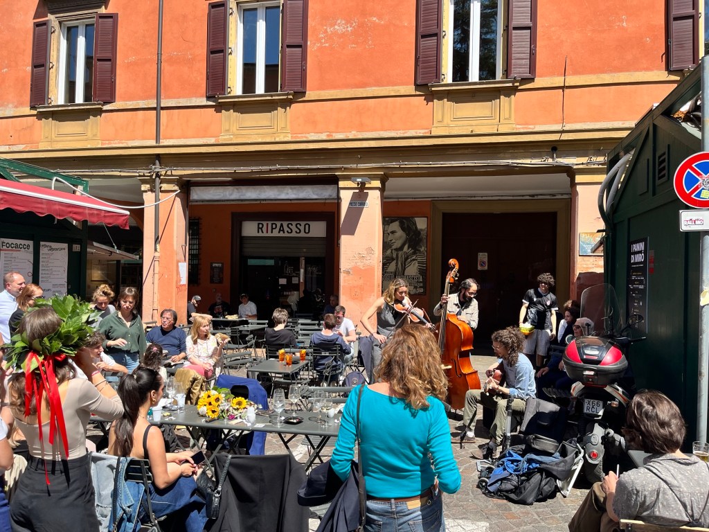 One of the wonderful graduation traditions in Italy is the wearing of a laurel crown and ribbon. As university students in Italy can retake exams until they are satisfied with the results, students are finishing up their graduation requirements at any given time. The tradition is to celebrate with friends in the streets, and we got to witness a lovely celebration outside I Panini di Mirò as a happy graduate and her friends and family were serenaded by a talented jazz trio to mark the occasion. It was a great afternoon. For the graduate and for us.