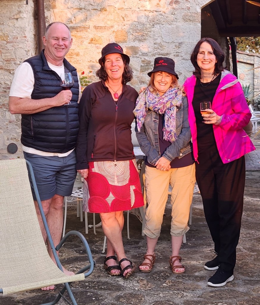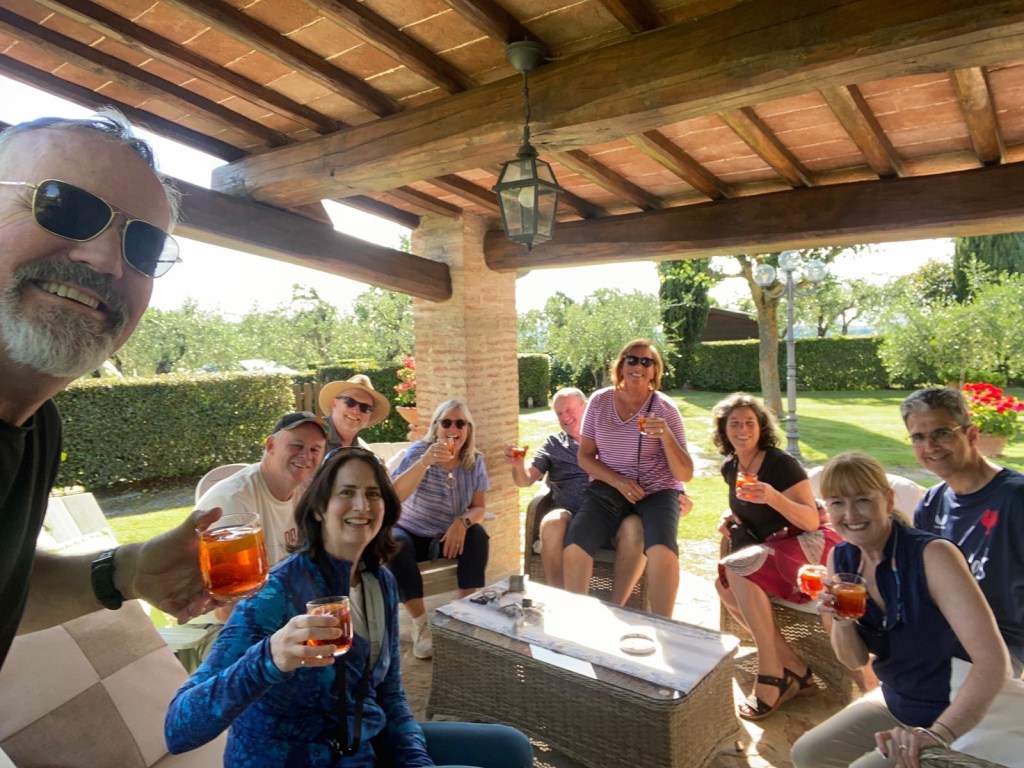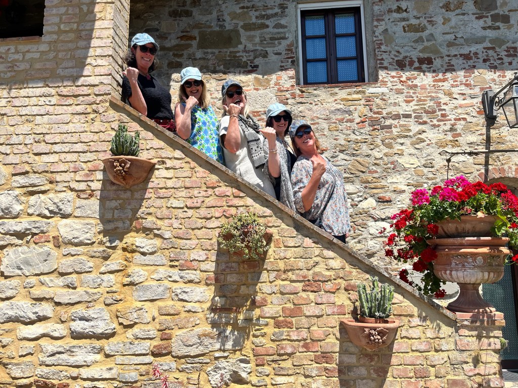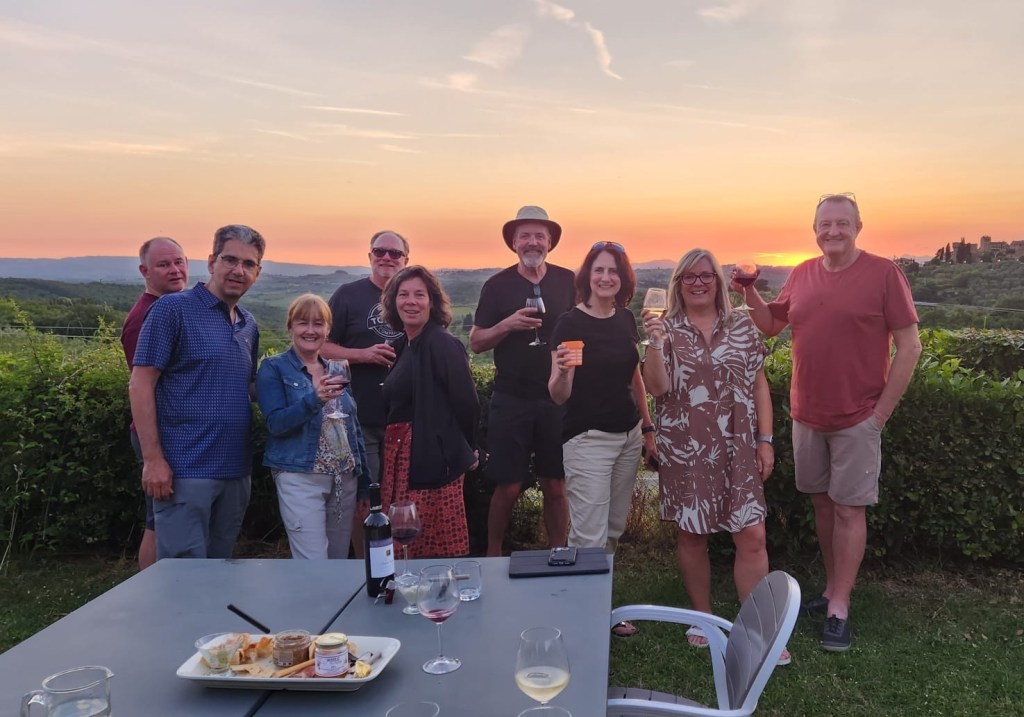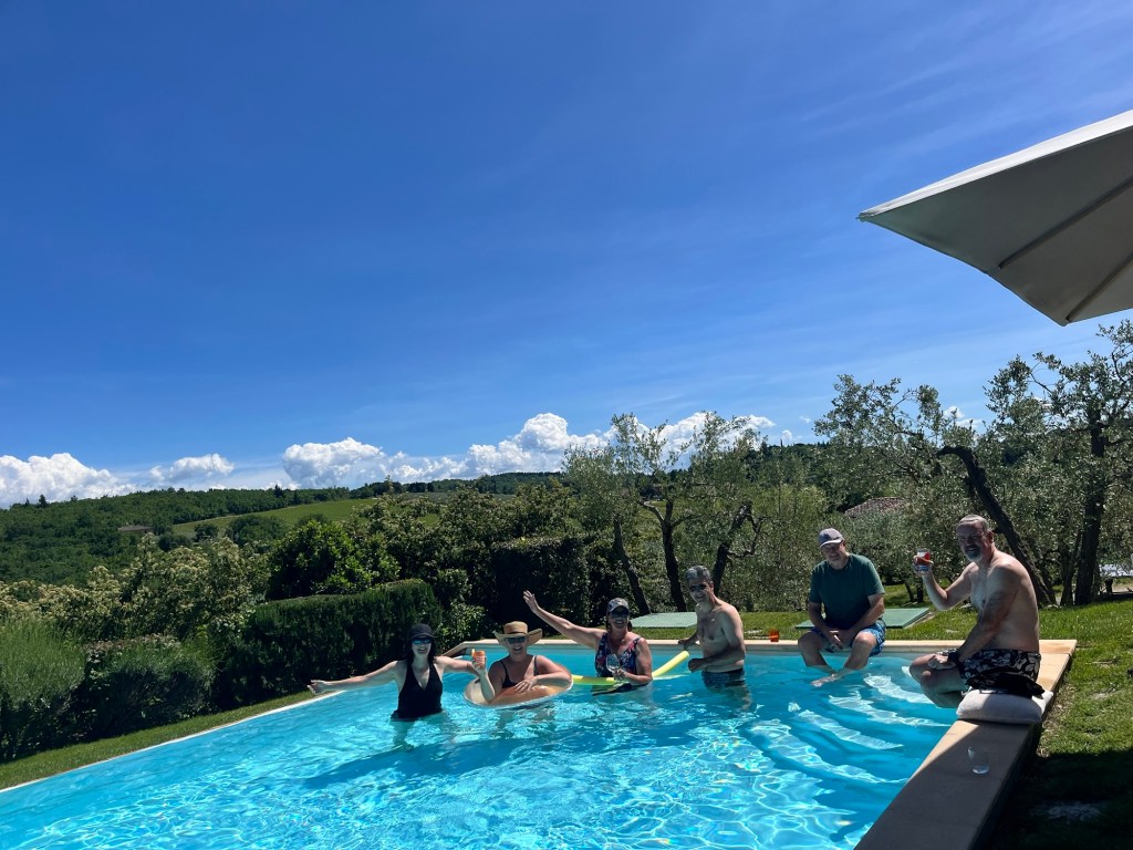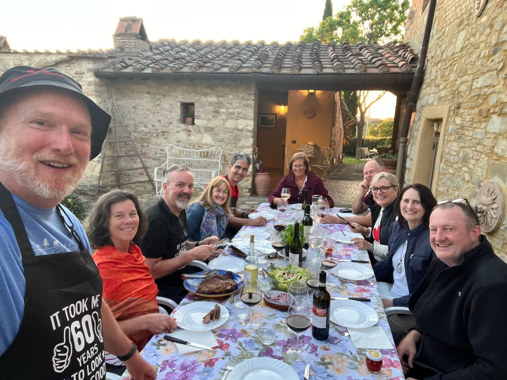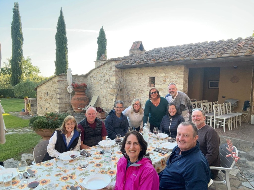 We started talking about a university friends reunion in Italy to celebrate over 40 years of friendship and the 60th birthdays for most of our group a few years back. Serious planning got underway last summer. The consensus was that we wanted to rent a villa in Tuscany for a week, and Sarah’s husband Ian took on the thankless task of looking for a spot that fit our criteria (whole place to ourselves, lots of indoor and outdoor space, great location, incredible view, private bathrooms for each bedroom, big kitchen, reasonable cost, etc…). He nailed it with Villa Sonia, located at the edge of the village of San Donato in the heart of Chianti wine country.