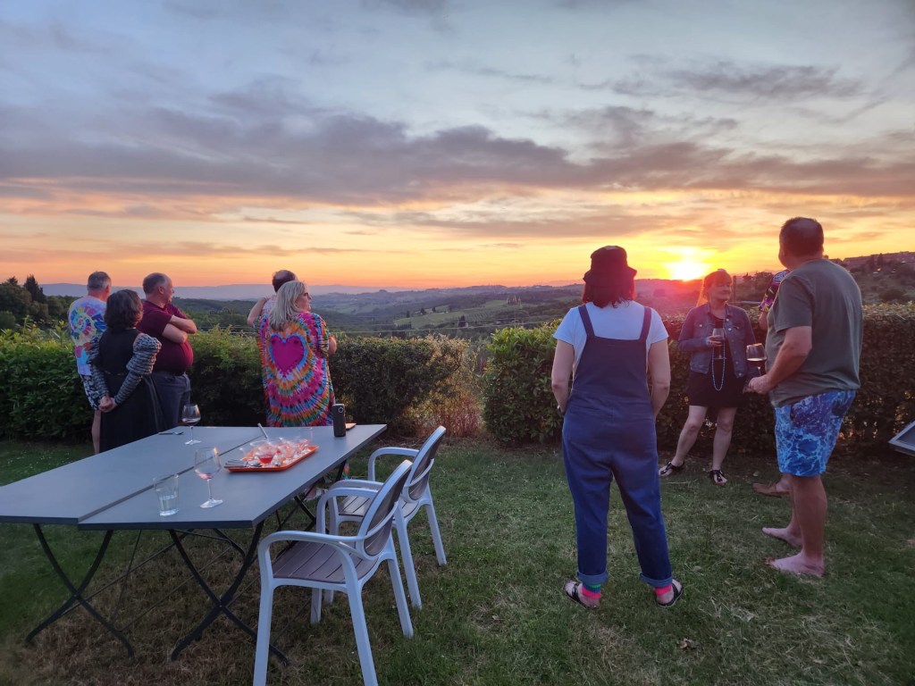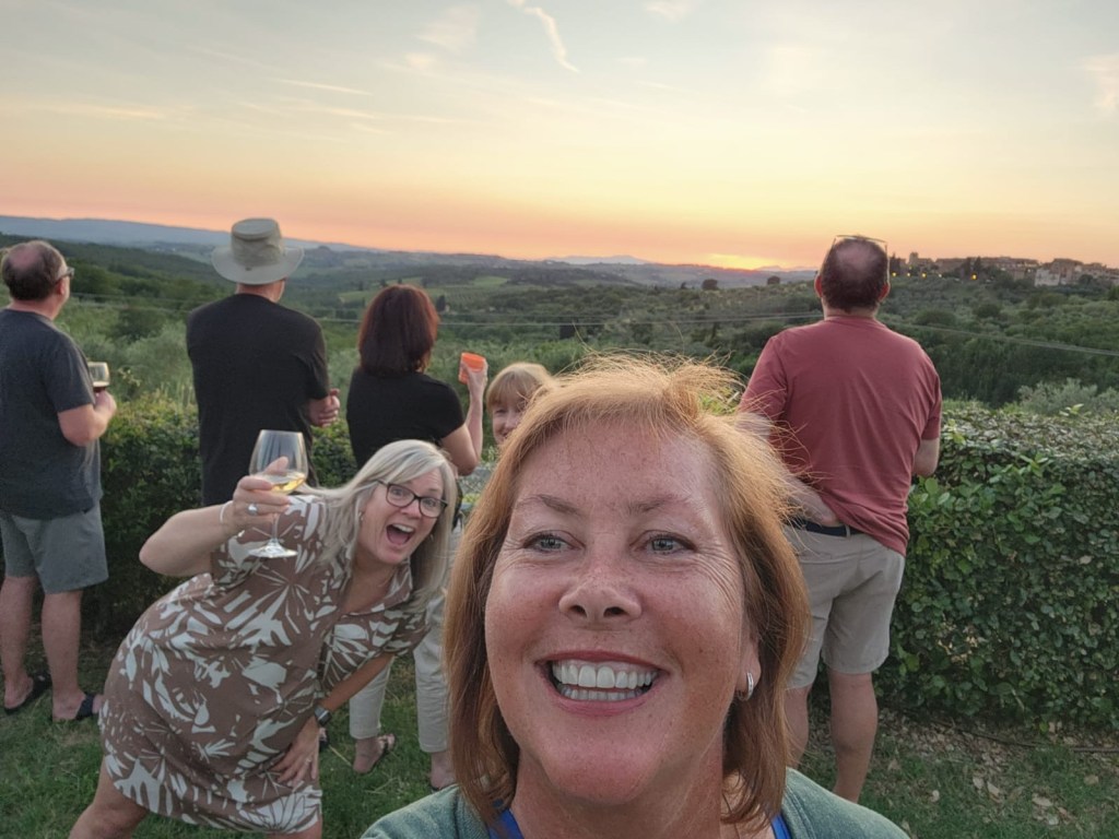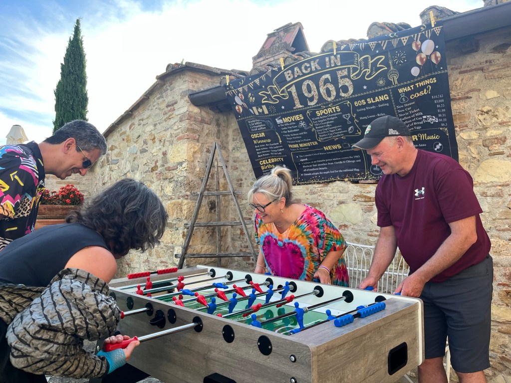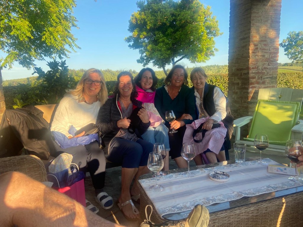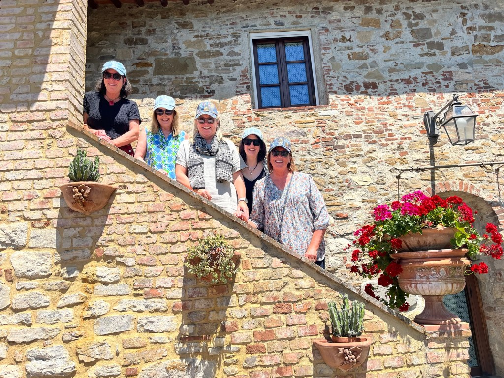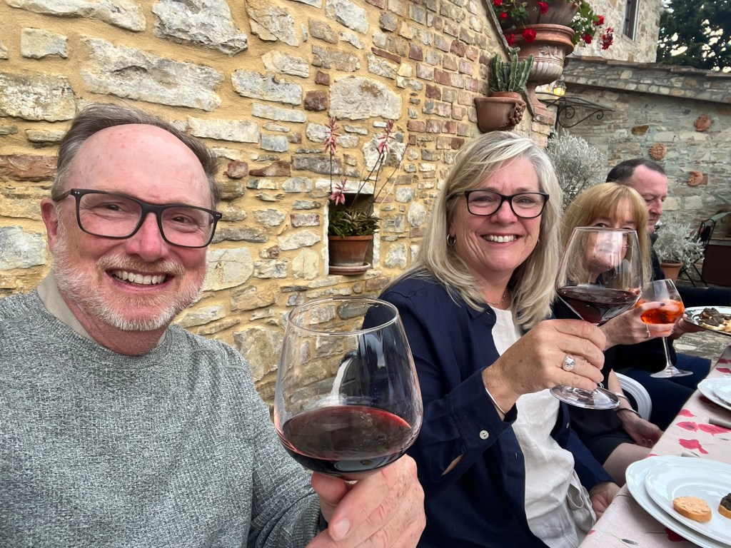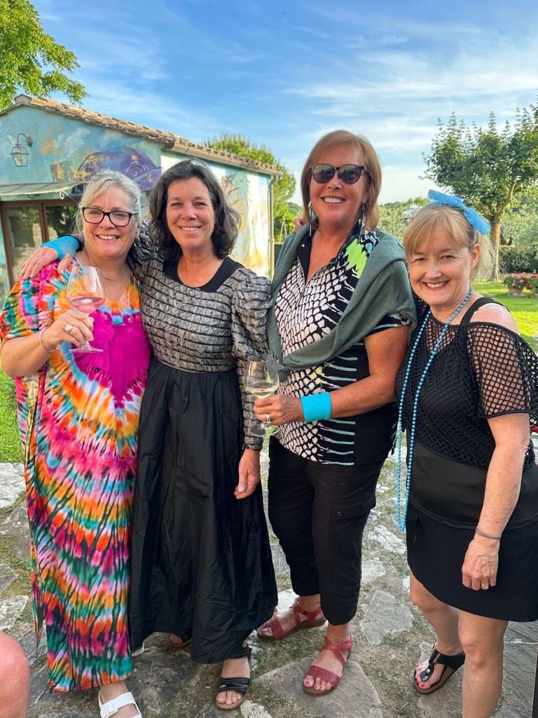 We started talking about a university friends reunion in Italy to celebrate over 40 years of friendship and the 60th birthdays for most of our group a few years back. Serious planning got underway last summer. The consensus was that we wanted to rent a villa in Tuscany for a week, and Sarah’s husband Ian took on the thankless task of looking for a spot that fit our criteria (whole place to ourselves, lots of indoor and outdoor space, great location, incredible view, private bathrooms for each bedroom, big kitchen, reasonable cost, etc…). He nailed it with Villa Sonia, located at the edge of the village of San Donato in the heart of Chianti wine country.