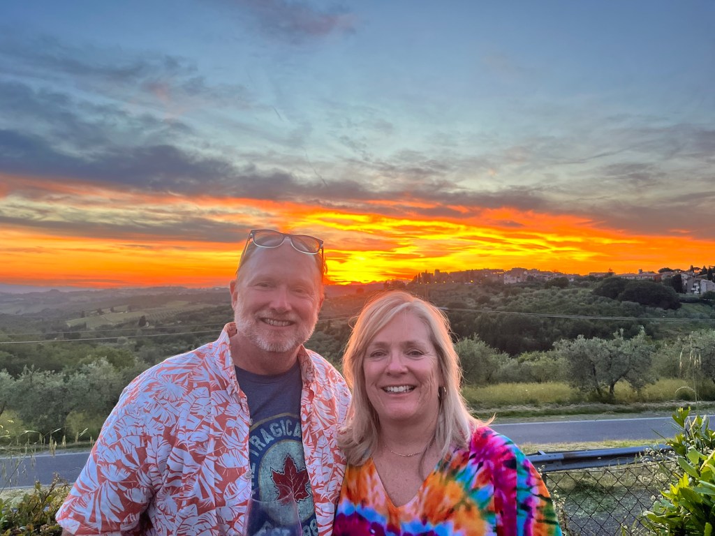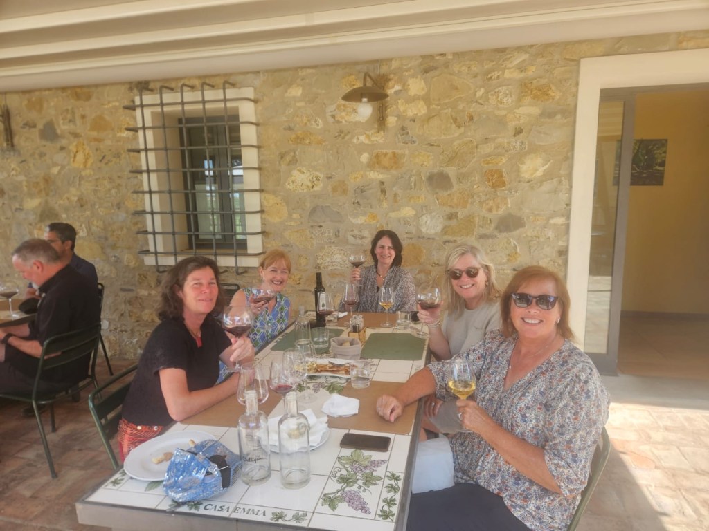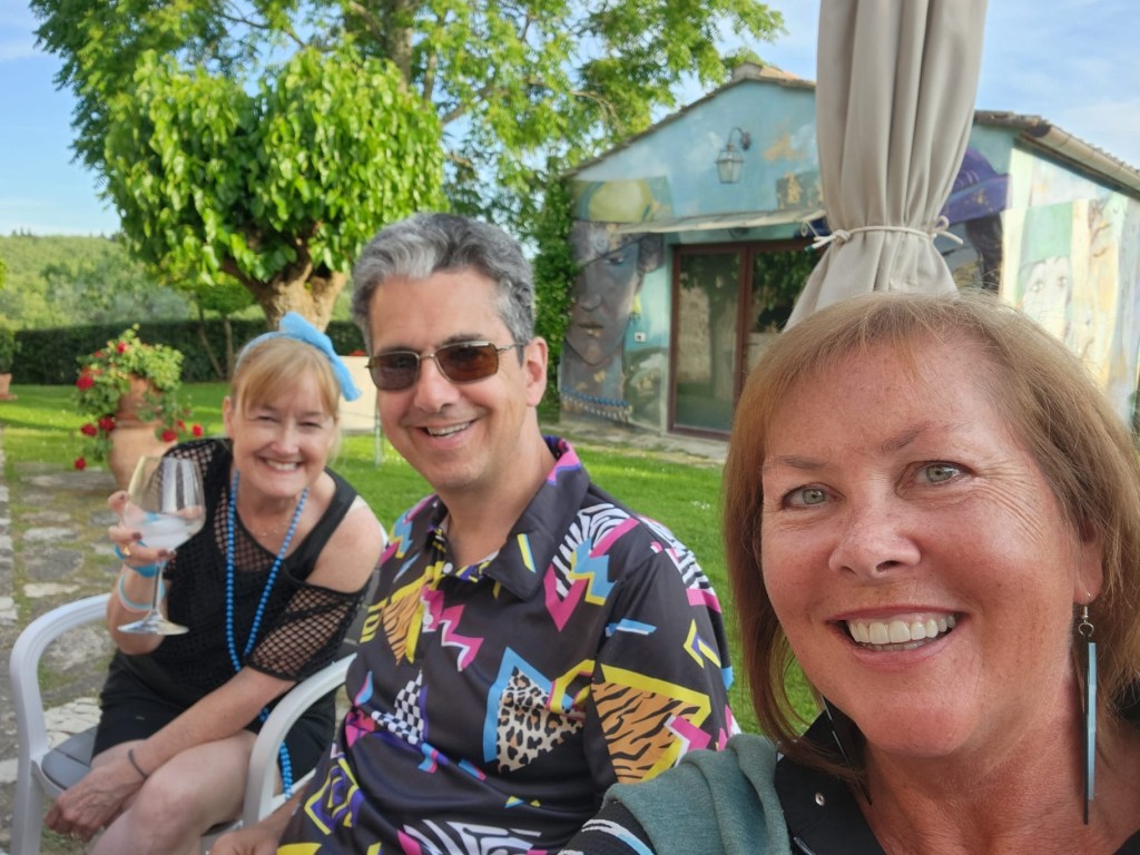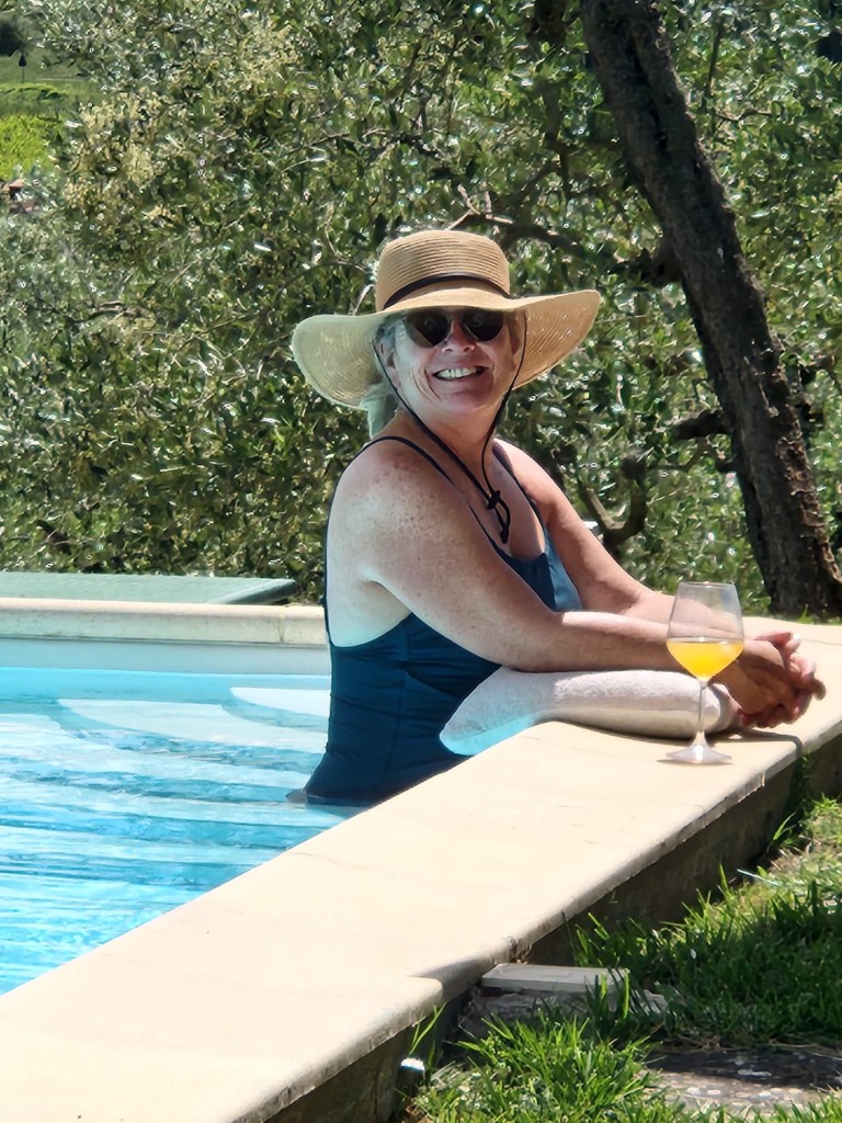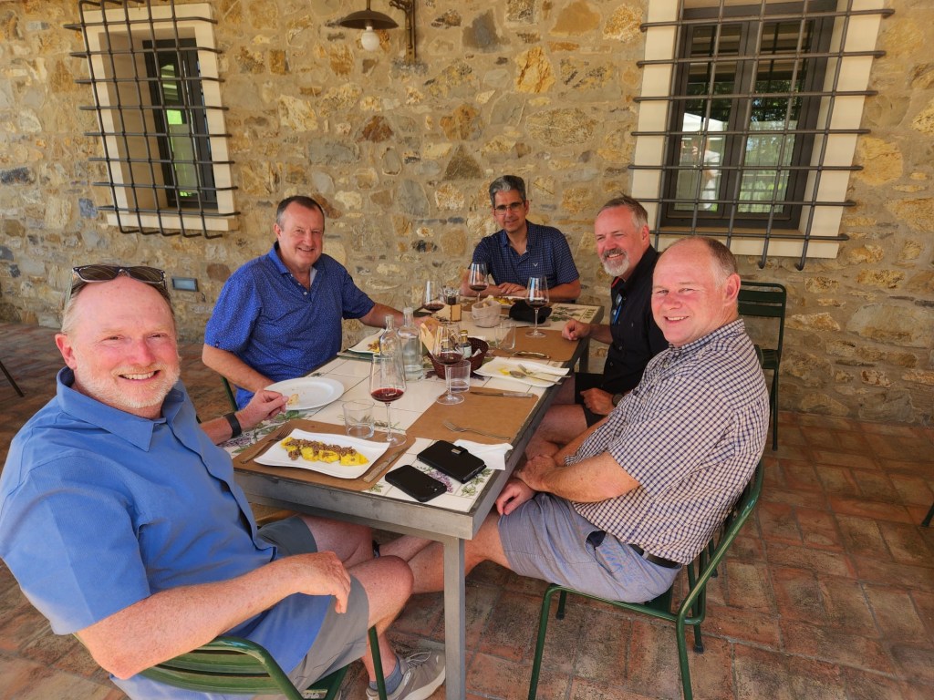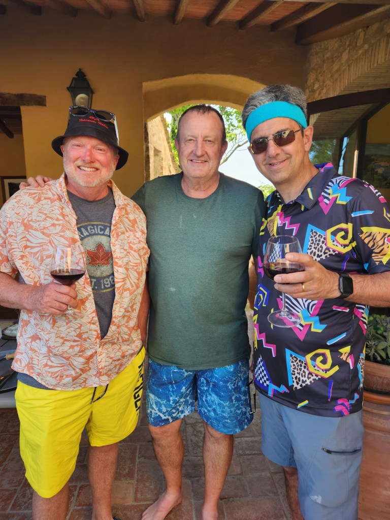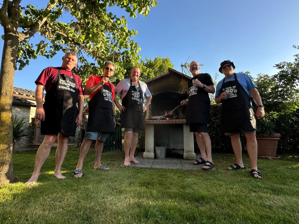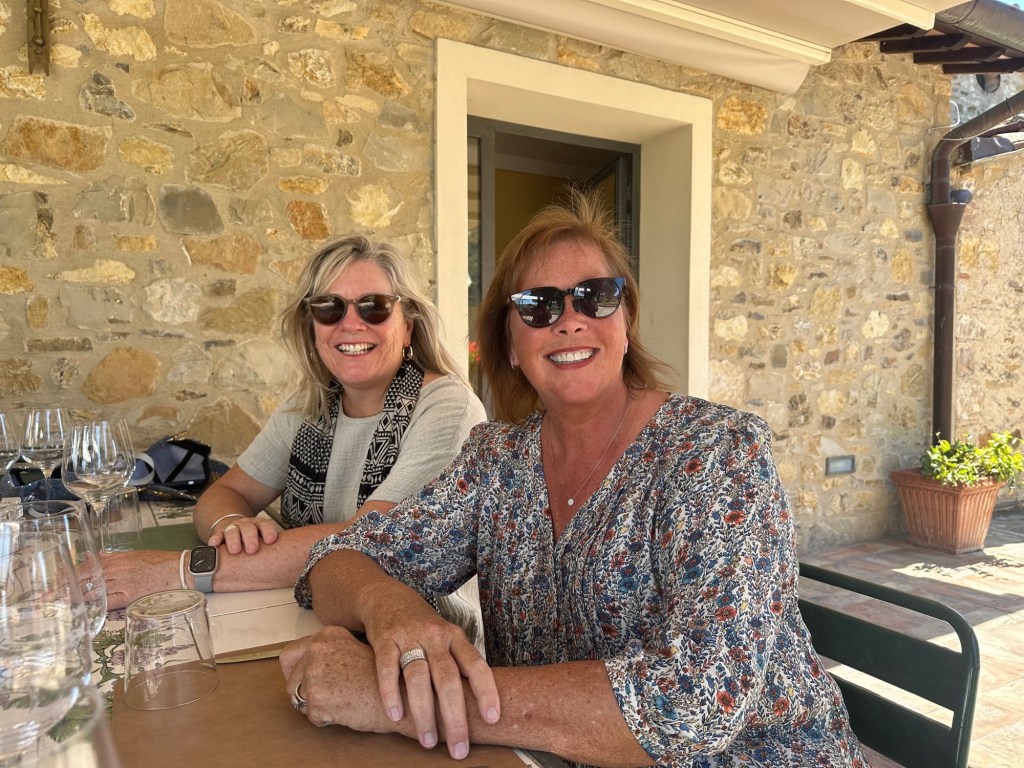 We started talking about a university friends reunion in Italy to celebrate over 40 years of friendship and the 60th birthdays for most of our group a few years back. Serious planning got underway last summer. The consensus was that we wanted to rent a villa in Tuscany for a week, and Sarah’s husband Ian took on the thankless task of looking for a spot that fit our criteria (whole place to ourselves, lots of indoor and outdoor space, great location, incredible view, private bathrooms for each bedroom, big kitchen, reasonable cost, etc…). He nailed it with Villa Sonia, located at the edge of the village of San Donato in the heart of Chianti wine country.