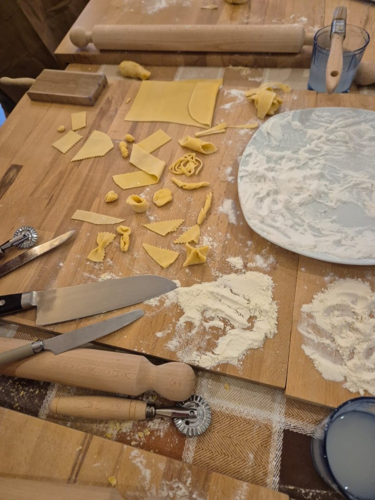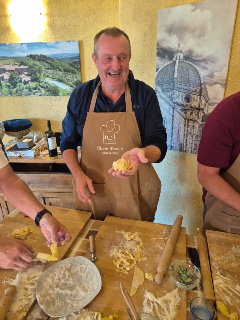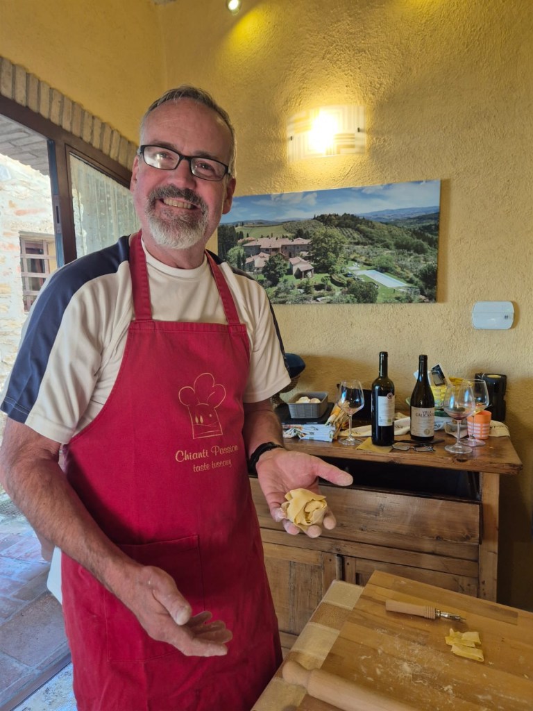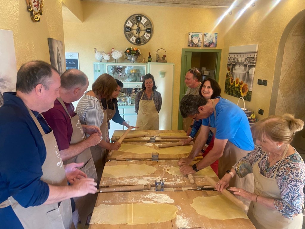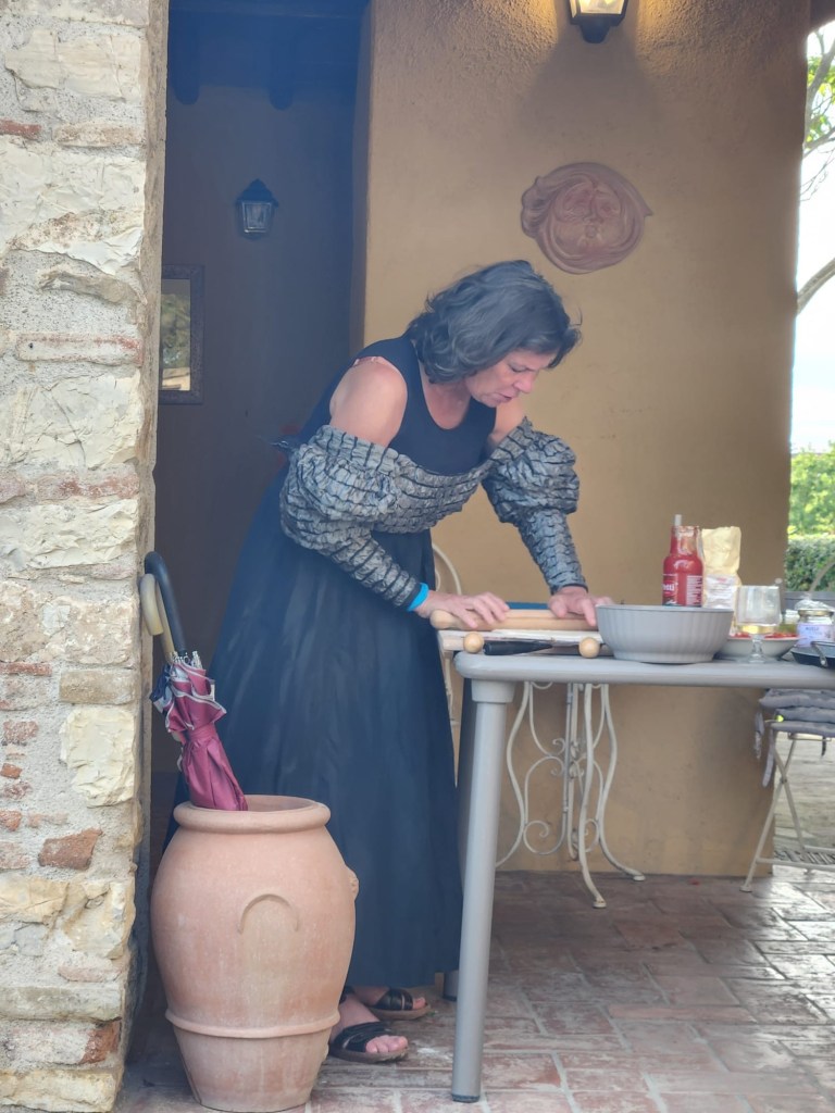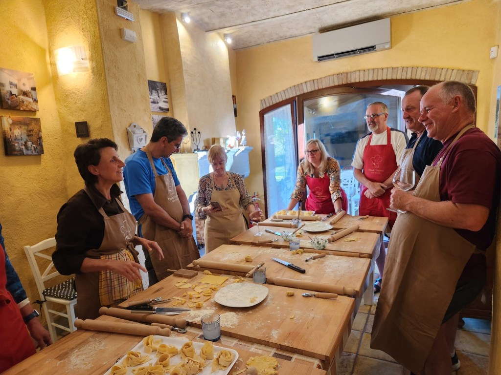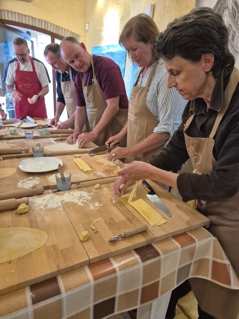 Ian organized two special events at the villa, the first being a pasta making class on Sunday night. We had a great time preparing ravioli and tagliatelle with tomato sauce, as well as a panacotta desert, which we then enjoyed together outside. It was good fun, and we learned some new (for us) tricks and techniques.