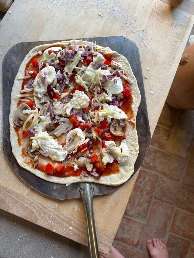 While it was a team effort assembling the pizzas, Graham made the dough and chopped up the ingredients earlier in the day, and weilded the giant pizza peel.